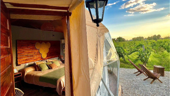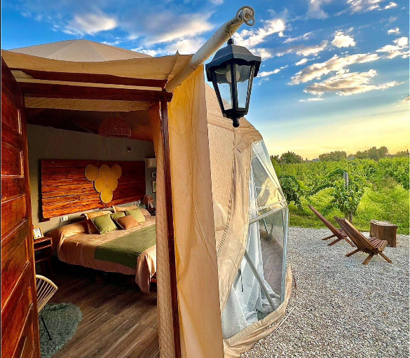 Entre Racimos es un glamping exclusivo ubicado en medio de los viñedos de Cava Don Tulio, en Carrodilla, Luján de Cuyo (Mendoza), ideal para quienes buscan una estadía diferente, en contacto directo con la naturaleza y el mundo del vino. Este alojamiento enogastronómico combina el encanto de dormir entre racimos de vid con comodidades modernas y vistas panorámicas de las montañas, convirtiéndose en una opción destacada de alojamiento en Mendoza para parejas y viajeros que valoran experiencias auténticas enoturísticas.