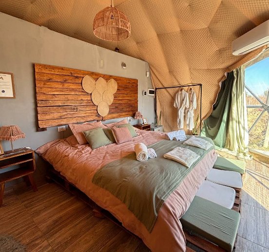 Además de la comodidad de sus instalaciones, Entre Racimos ofrece la posibilidad de disfrutar del enoturismo local: menús de degustación de plato y vino, almuerzos maridados con vinos de la bodega Cava Don Tulio y actividades opcionales como masajes descontracturantes o experiencias artísticas, para complementar tu estadía con momentos especiales. Su ubicación a solo 10 minutos de la ciudad de Mendoza permite combinar naturaleza, vino y cultura con facilidad, convirtiendo este glamping en una propuesta completa para unas vacaciones inolvidables en la región.