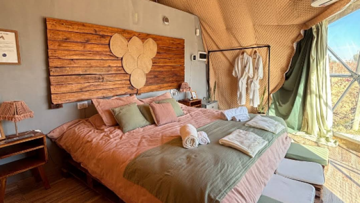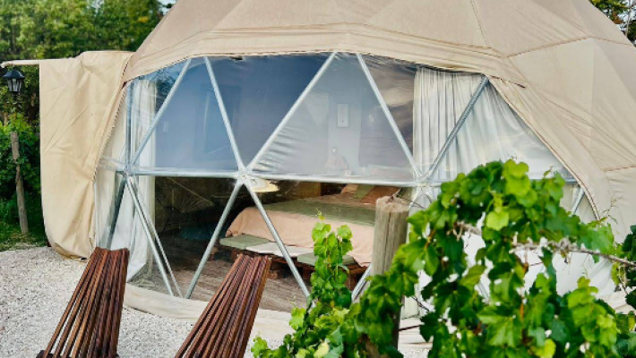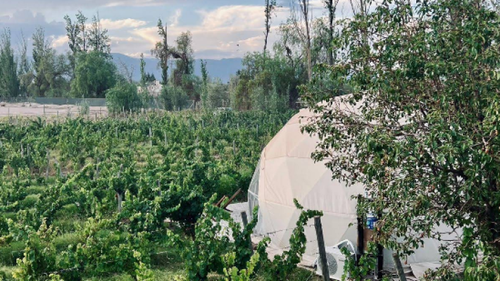 Cada experiencia en Entre Racimos se desarrolla en domos glamping inspirados en etapas del ciclo vegetativo de la vid, como Envero y Cosecha, que cuentan con capacidad para dos personas, cama sommier king, baño privado, Smart TV y Wi-Fi gratuito. La estadía incluye desayuno y está pensada para que los huéspedes vivan un entorno relajante rodeado por el paisaje vitivinícola, con amaneceres y atardeceres memorables entre filas de viñas y cerros mendocinos.
