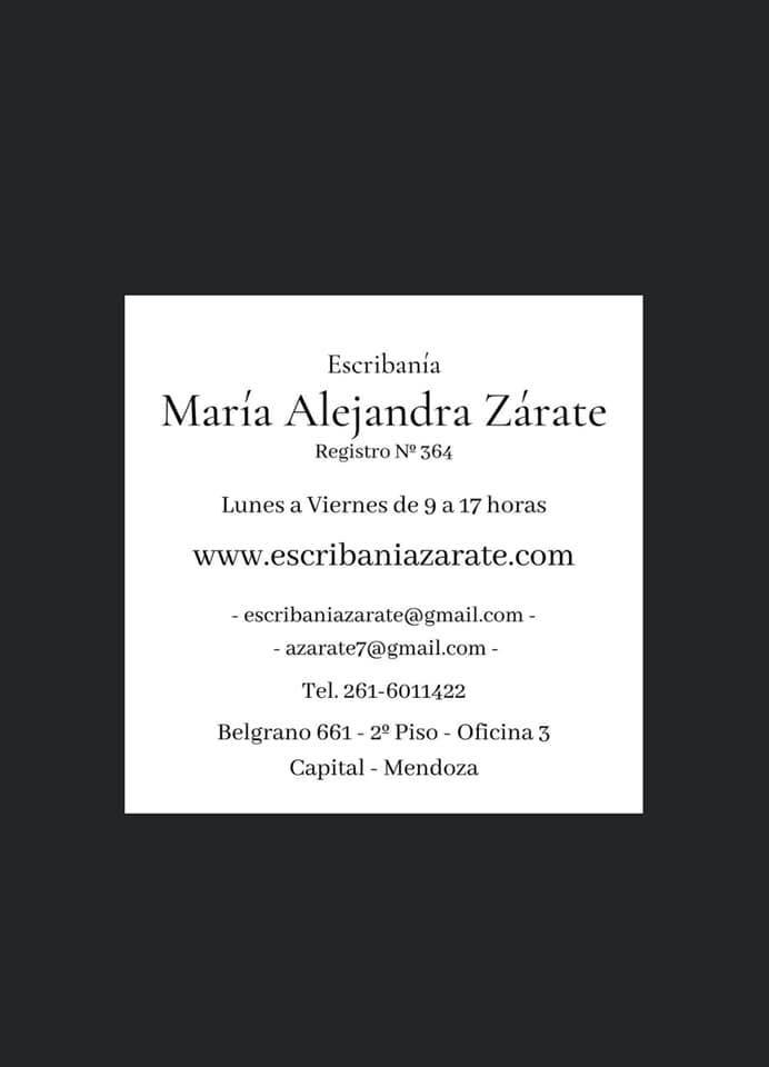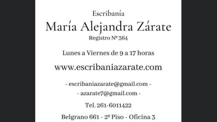 Escribanía Zárate es un estudio notarial ubicado en la Ciudad de Mendoza que brinda servicios profesionales vinculados al derecho notarial y registral. El estudio trabaja con particulares, empresas y profesionales que necesitan formalizar actos jurídicos mediante instrumentos públicos, ofreciendo asesoramiento especializado para garantizar seguridad jurídica en cada operación.