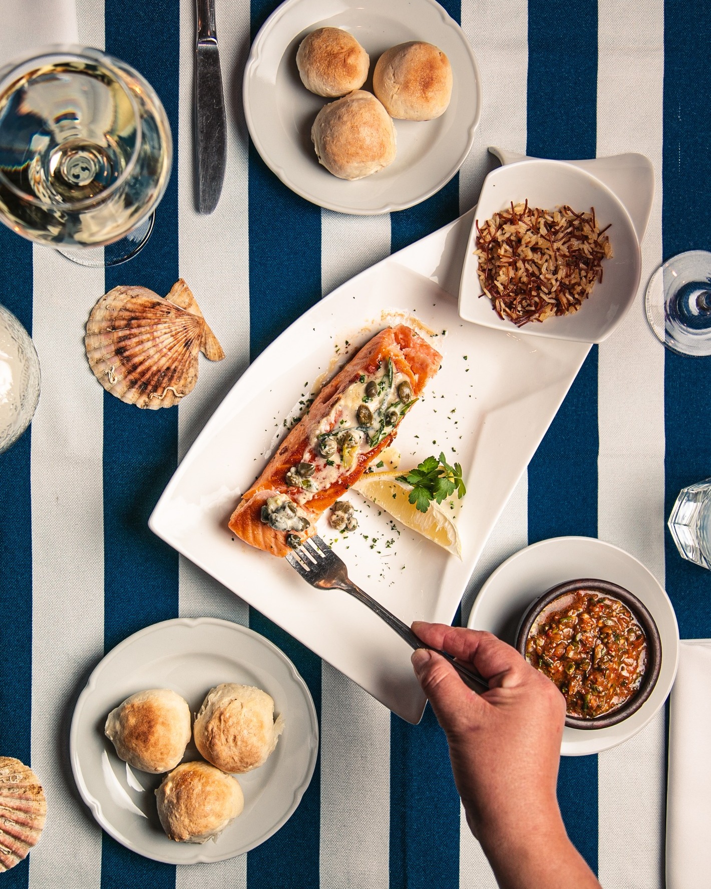 La carta de Mar y Monte incluye una variedad de especialidades que van desde frutos del mar fríos, tibios y calientes, como empanadas de trucha o camarón y risottos de mariscos, hasta platos emblemáticos como salmon del sur de Chile, merluza negra grillada y pastas con ingredientes de montaña. Las recetas reflejan la riqueza de dos tradiciones culinarias hermanadas por la geografía y la historia, con toques de ingredientes autóctonos que hacen de cada plato una experiencia memorable.